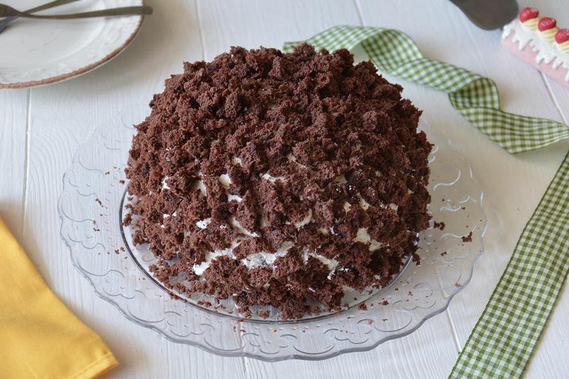 Come nella sua versione tradizionale anche questa torta è composta da un cuore centrale del dolce rivestito di grosse briciole di pan di Spagna, mentre il ripieno è una crema diplomatica.