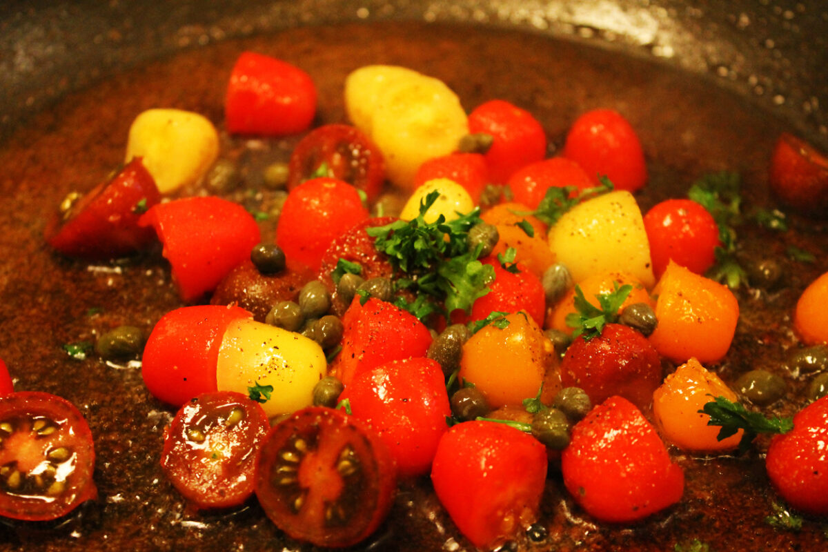 - In una padella antiaderente disporre uno strato di pomodorini. Ai restanti pomodorini, aggiungere un pò di prezzemolo tritato e le olive tagliate a strisce, salare e condire.
